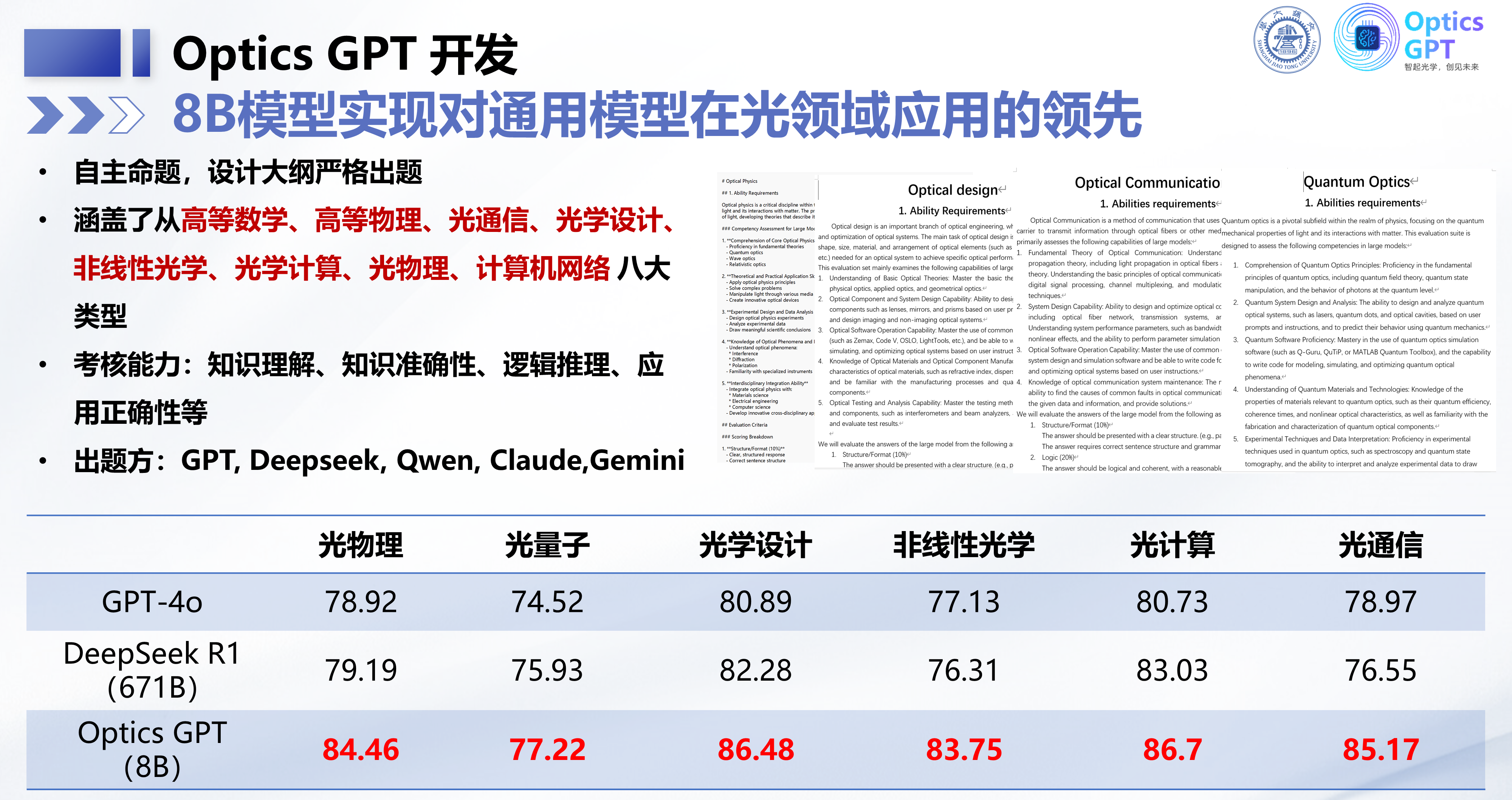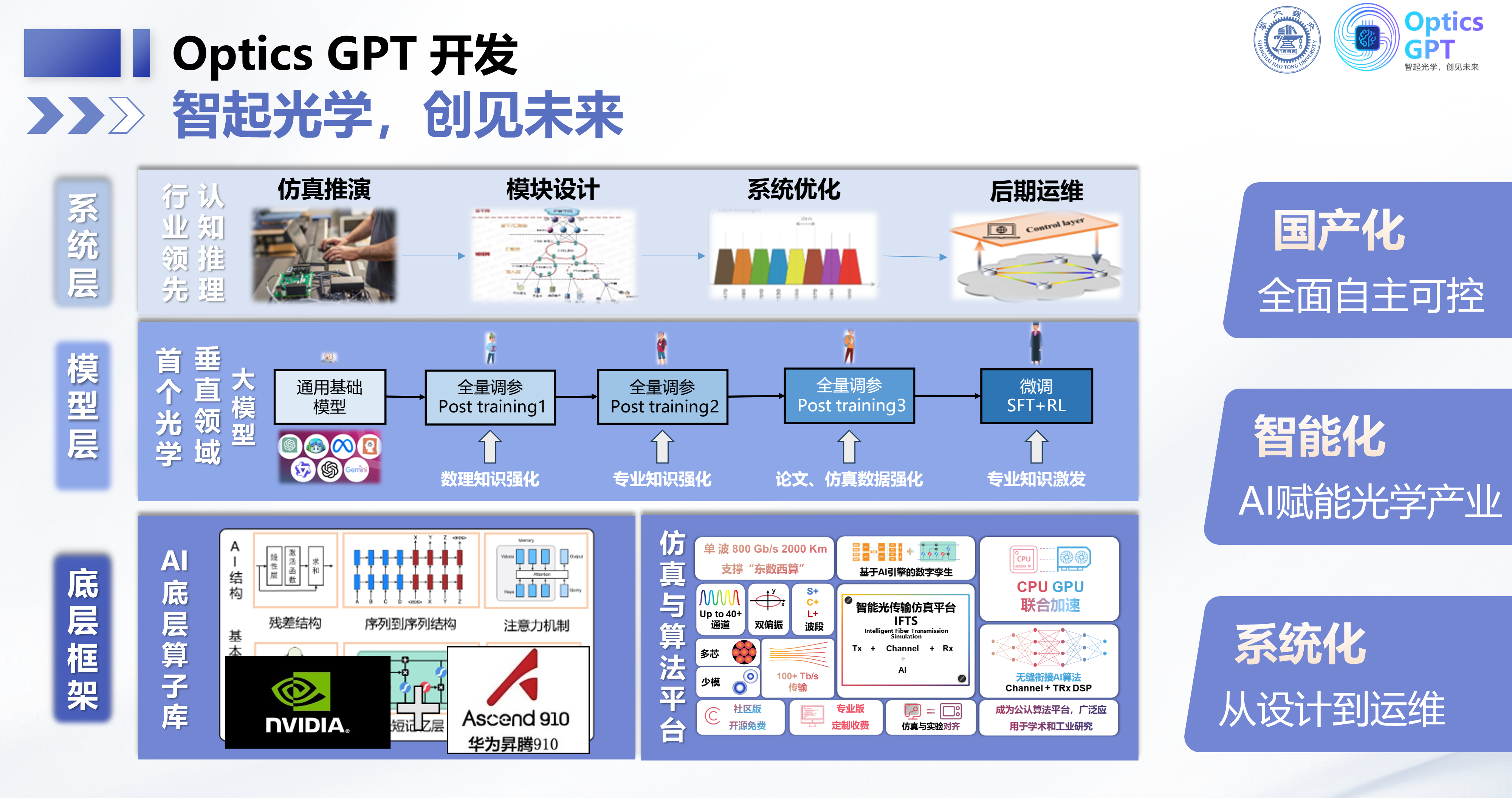 Optics GPT是基于深度学习架构研发的国内首个面向光领域的垂直大语言模型,旨在满足光学科研人员、光通信工程师及产业技术专家对专业AI工具的需求。 Optics GPT 并非通用大模型的简单微调,而是严格遵循“预训练-有监督精调-强化学习”的全栈技术链路,从零开始培育的 “光学原生”智能体,能够理解并生成光学设计、信号处理算法、系统诊断等复杂任务的解决方案。Optics GPT不仅是一个AI模型,更是一个可安全部署的 “虚拟光学专家” ,旨在为光网络的智能化设计、运维、优化以及前沿研究,提供一个高效、可靠的核心驱动力,开启“AI+光学”深度融合的新纪元。